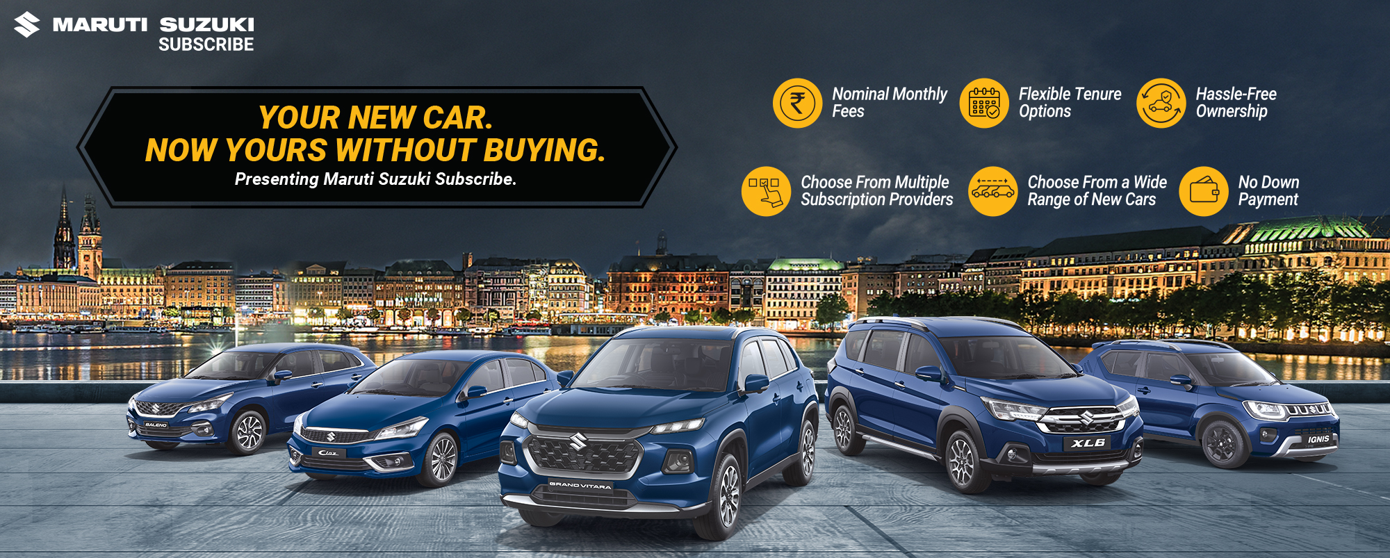 Maruti Suzuki Subscribe enables all customers to enjoy driving their preferred Maruti Suzuki cars without having to deal with all the financial responsibilities that come with owning a car.All you need to do is opt for a monthly subscription plan at a fixed monthly fee, which includes the routine maintenance and insurance costs, and choose a flexible tenure. At Fair Deal Premium Wheels in, Akshardham, New Delhi, all Hatchback, Sedan, SUV, the MUV models line-up includes Baleno, Invicto, EVitara, Jimny, Ciaz, Ignis, Fronx, Grand Vitara, XL6. Here, you will enjoy Maruti Suzuki Subscribe benefits such as:
